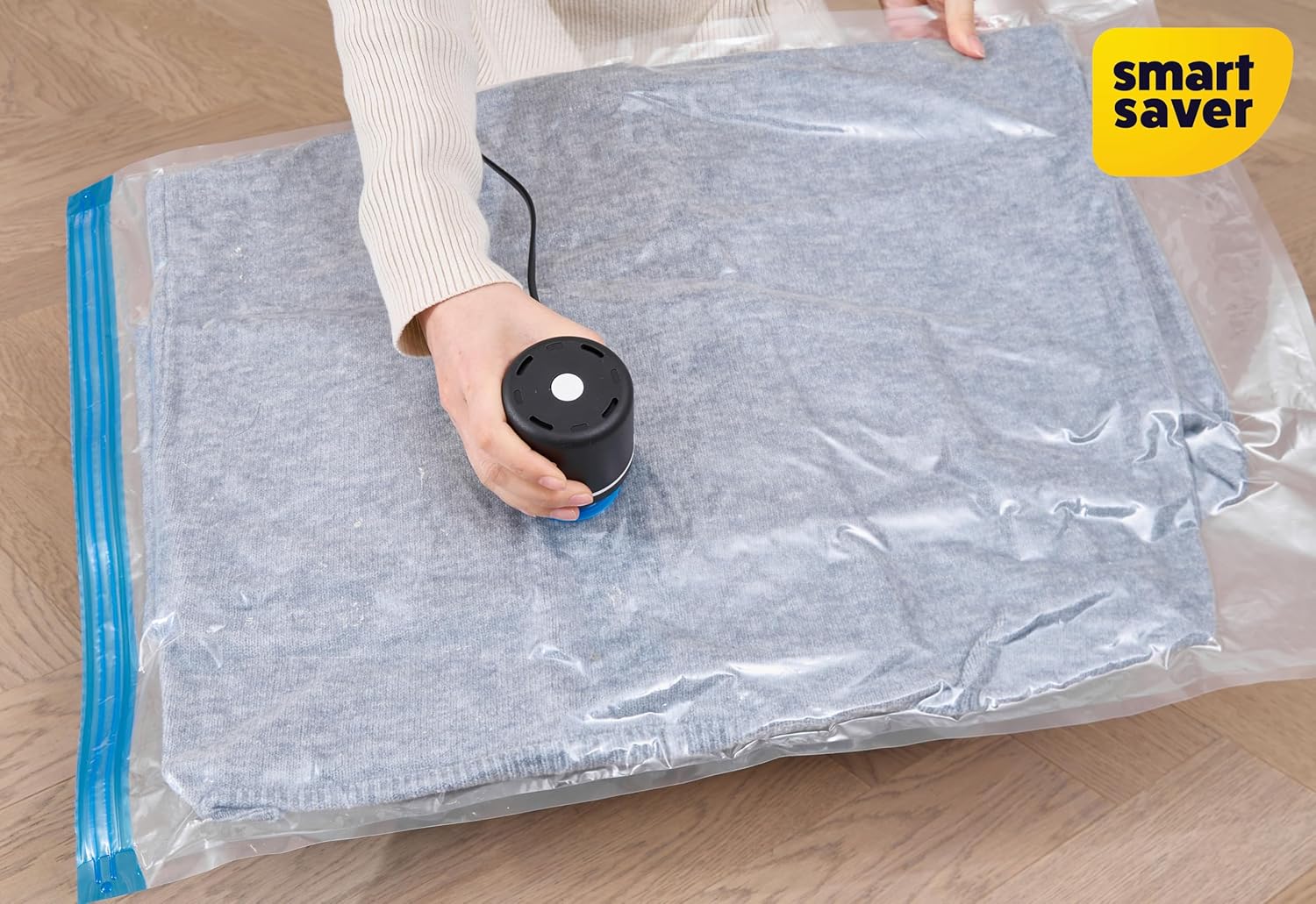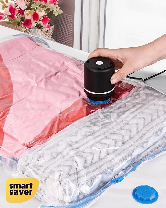 Smart Saver Vacuum Bags are a storage solution designed to maximize space and protect your belongings. These airtight bags can reduce the volume of your items by up to 80%, keeping them clean, compact, and shielded from dust, moisture, and pests.