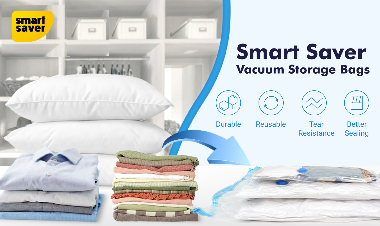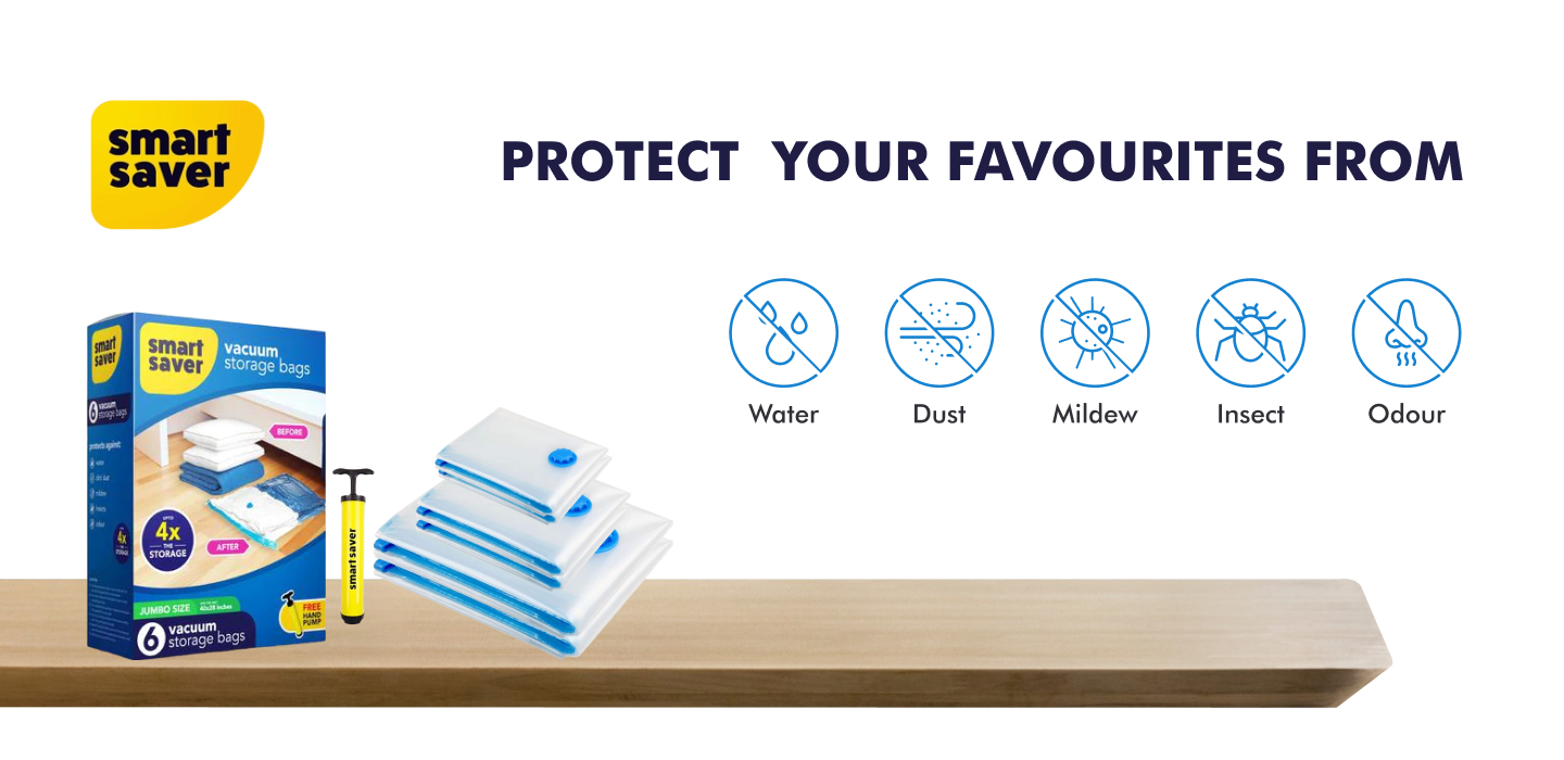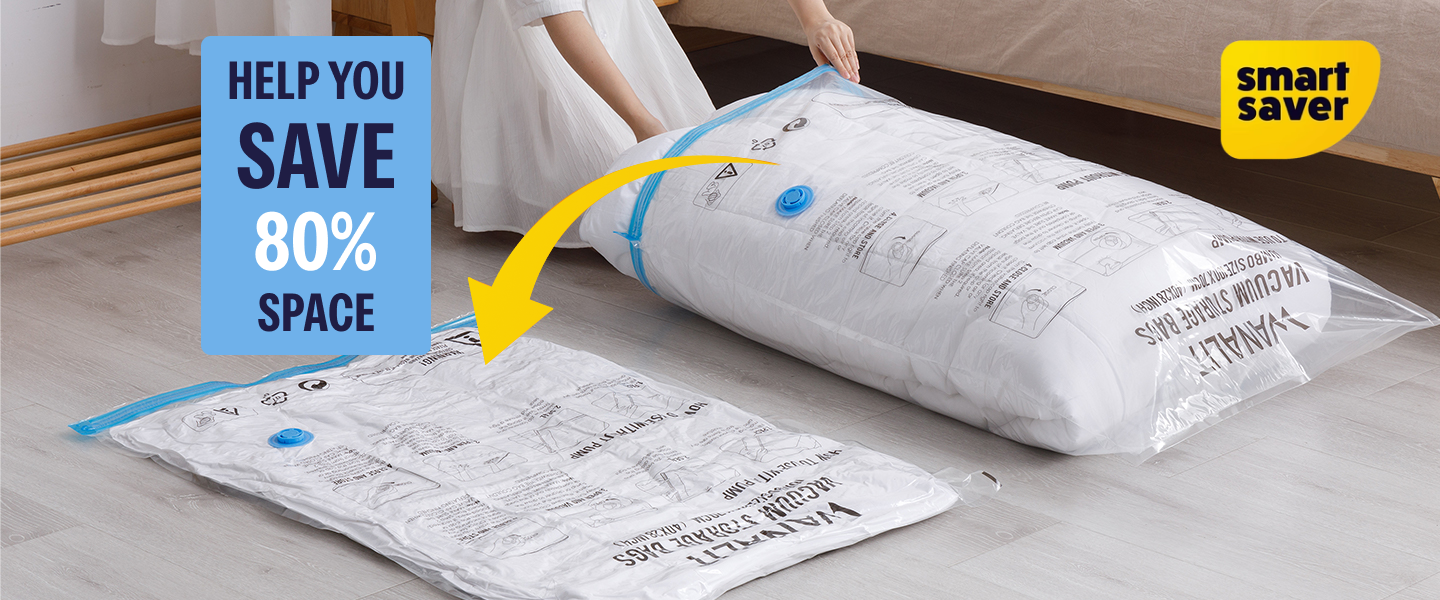 Smart Saver Vacuum Bags are a storage solution designed to maximize space and protect your belongings. These airtight bags can reduce the volume of your items by up to 80%, keeping them clean, compact, and shielded from dust, moisture, and pests.